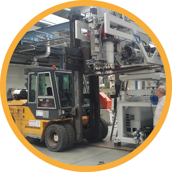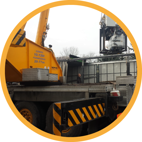 Dalszą czynnością wprowadzamy maszyny do wskazanych pomieszczeń, (hal magazynów) i ustawiamy w wyznaczonych miejscach przez klienta. Jeżeli maszyna przyjeżdża na palecie podnosimy urządzenie i wyciągamy spod niej paletę. Do wykonywania tych czynności używamy wózków widłowych, dźwigów specjalistycznych podnośników hydraulicznych oraz rolek transportowych.